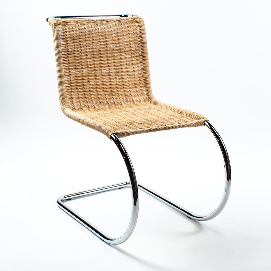 This reproduction of Mies van der Rohe’s Cantilever Cane Chair (MR10) is carefully handcrafted in Tuscany, Italy.  Both the cane and hide leather versions are finished in polished chrome.
